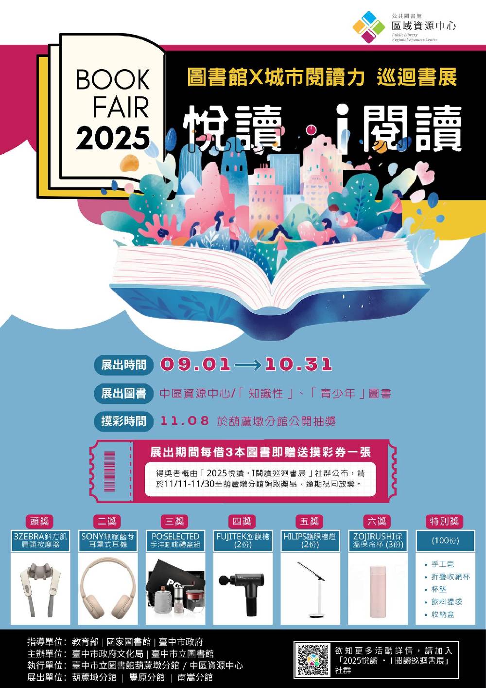 巡迴書展/暨借書摸彩活動開始囉!即日起至10月31日止,只要在中市圖葫蘆墩分館、豐原分館、豐原南嵩分館借閱巡迴展或中區資源中心圖書, 即可參加抽獎,獎品內容豐富,邀請您來參加。