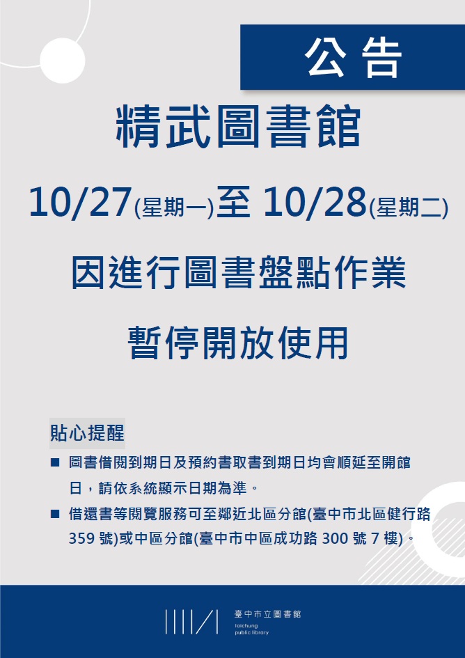 精武圖書館訂於10月27日(星期一)至10月28日(星期二)進行圖書盤點作業,暫停開放